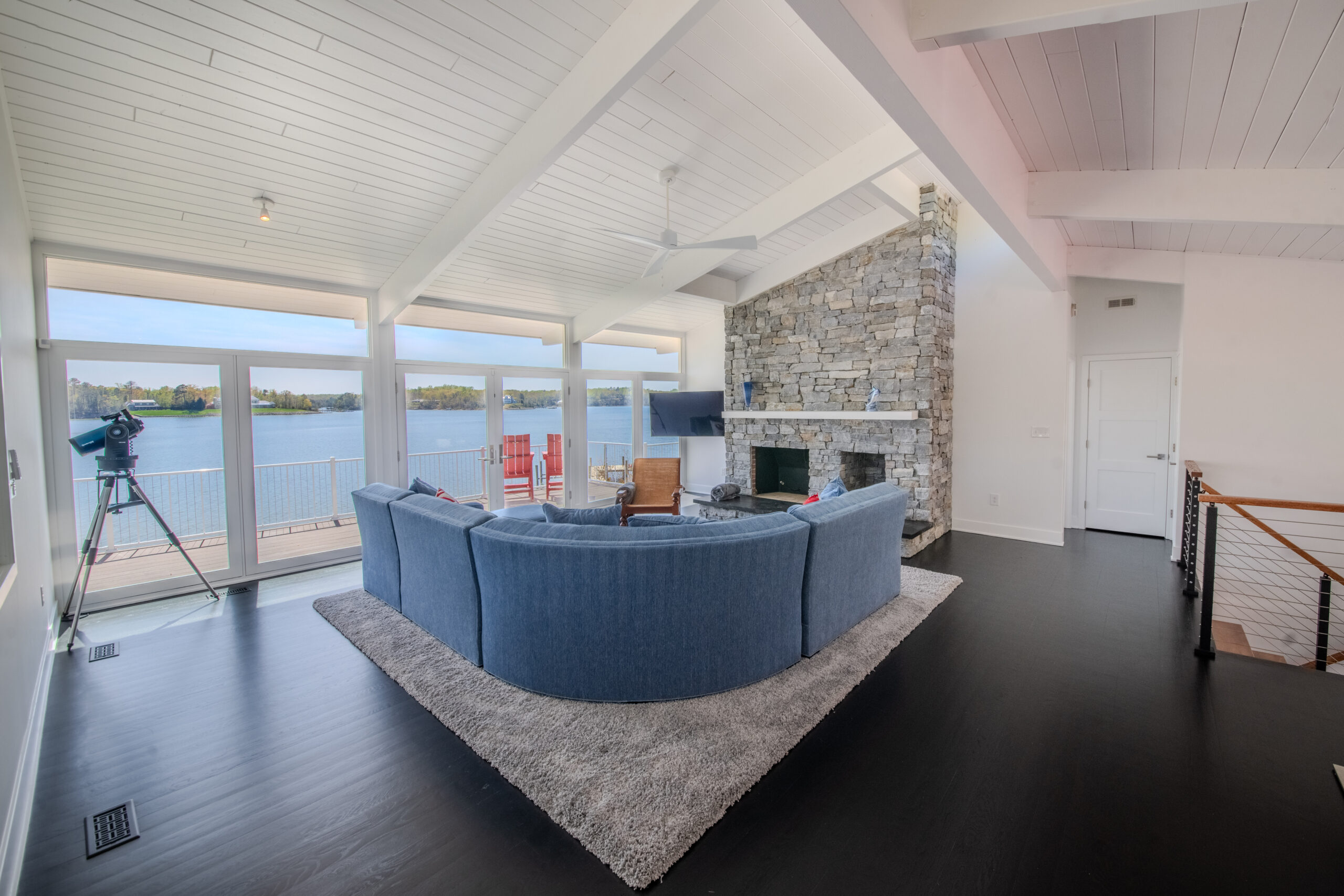 Contemporary elegance meets relaxed coastal charm throughout the main home. The first level showcases a DRAMATIC GREAT ROOM w/ vaulted plank ceiling, white oak flooring in ebony finish & stone fireplace w/ Virginia black granite hearth. Sliding doors open to a low-maintenance deck & joins a screened porch overlooking the river.