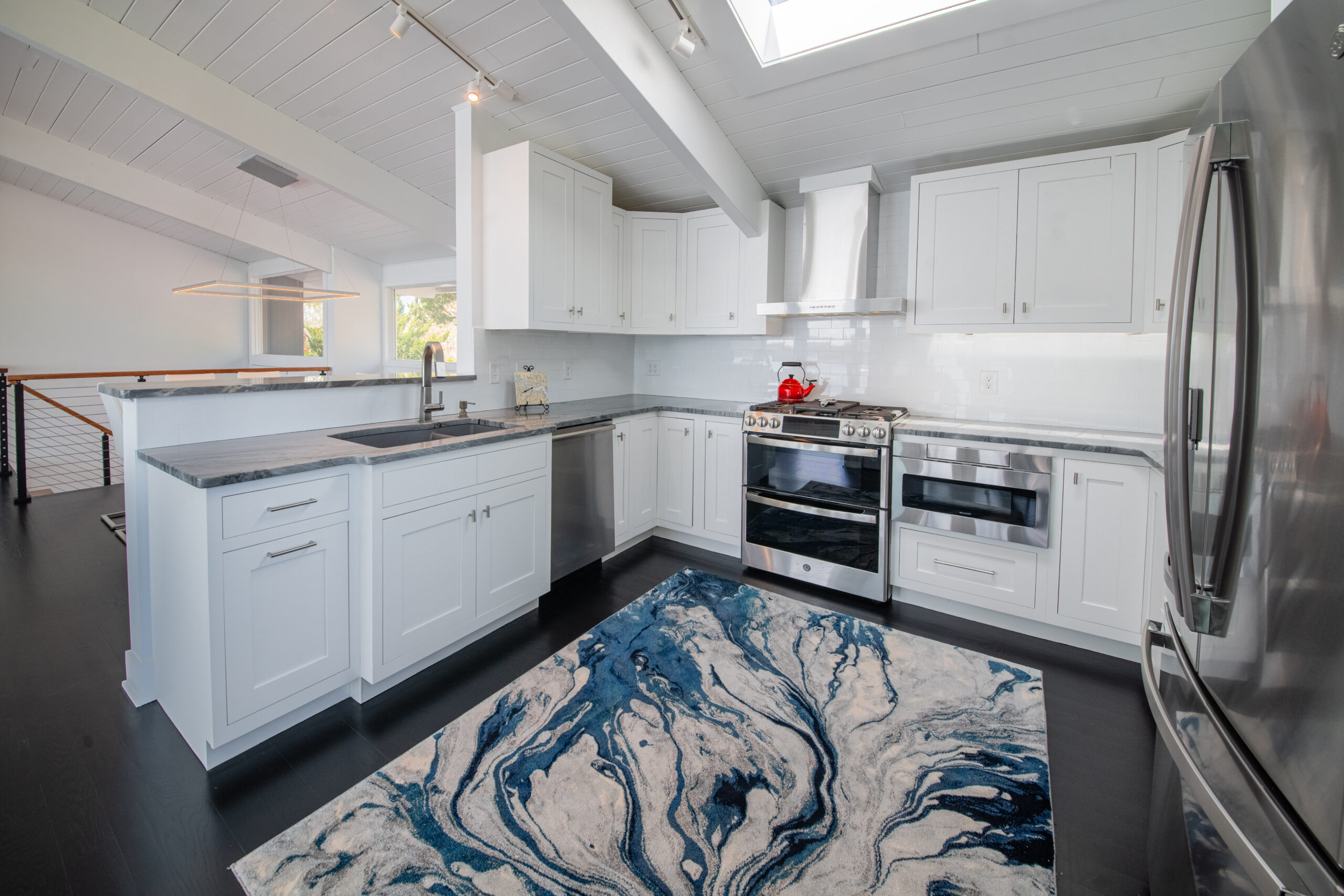 The NEW chef’s kitchen features SS appliances, gas range, double oven, GE Profile French door refrigerator, Shaker cabinetry, Super White quartzite countertops & tile backsplash. The dining room is highlighted by a custom table w/ matching quartzite top & designer chandelier.
