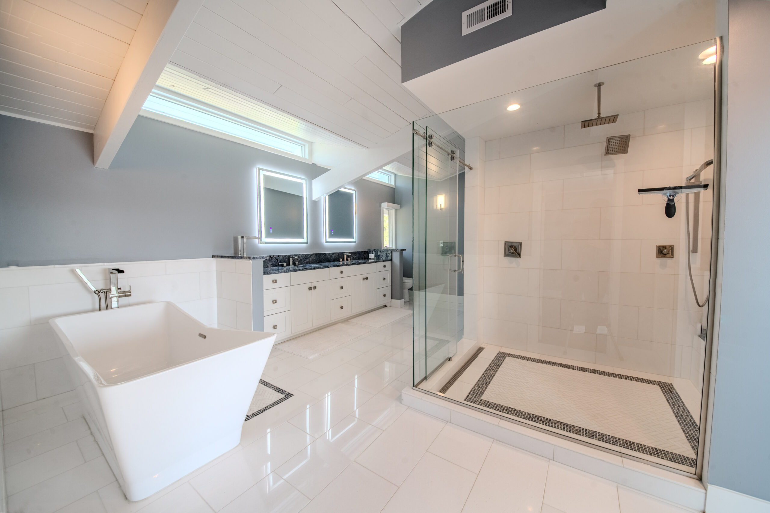 The main-level primary suite w/ automated blinds frames a picture-perfect water view & offers deck access & walk-in closet. The luxurious SPA BATH (new in 2020) features a freestanding soaking tub, glass-enclosed tiled shower w/ dual heads, dual vanity w/Bahia Blue granite, water-fall faucets, lighted smart mirrors & mosaic tile inlay accents.