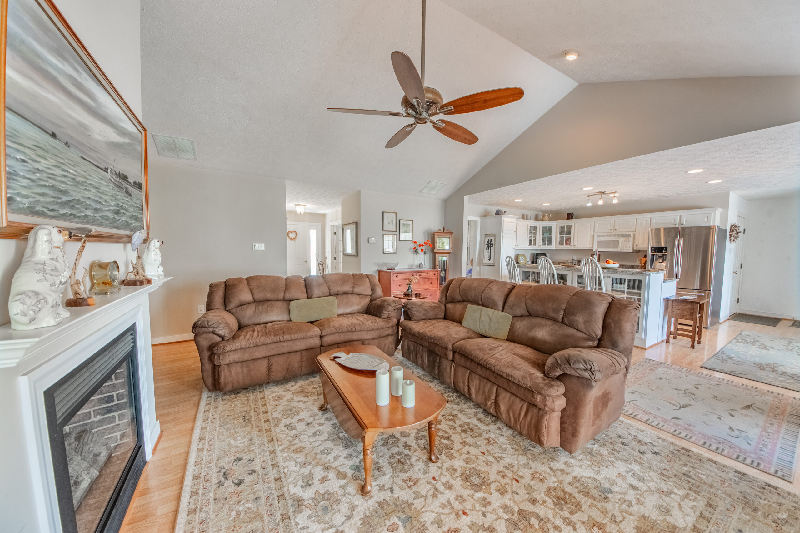 This inviting home offers an open, flowing floor plan with seamless transitions from the kitchen and vaulted living room with gas fireplace to the bright family/sunroom overlooking a spacious deck with hot tub. The bright, open kitchen is well-equipped with stainless steel appliances and a convenient dining bar.