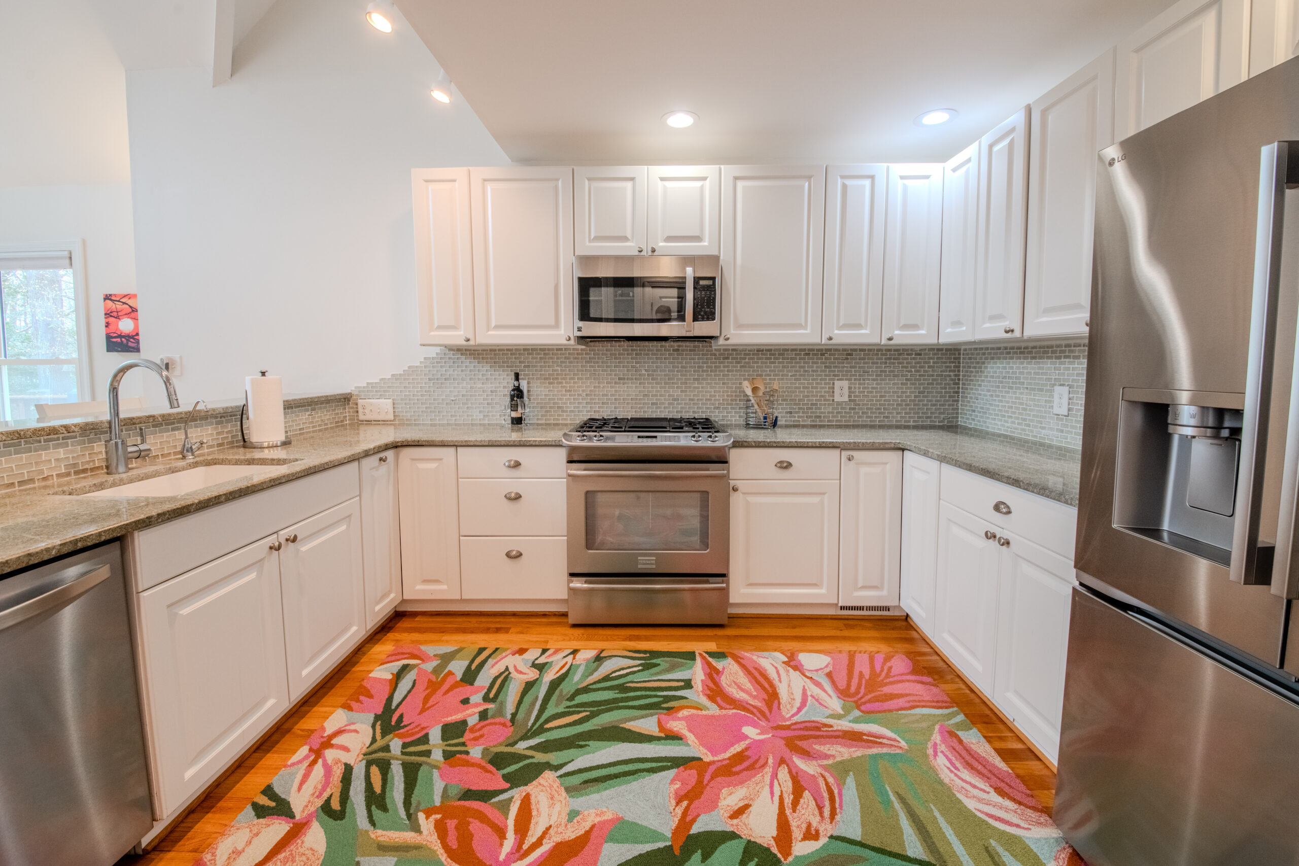 Offering over 3,000 square feet, the floor plan provides easy flow for everyday living and entertaining. The main level lives like a ranch, with the primary suite and two guest bedrooms. The chef’s kitchen features granite countertops, a Silestone undermount sink, and stainless appliances, including a French door refrigerator with specialty ice feature.